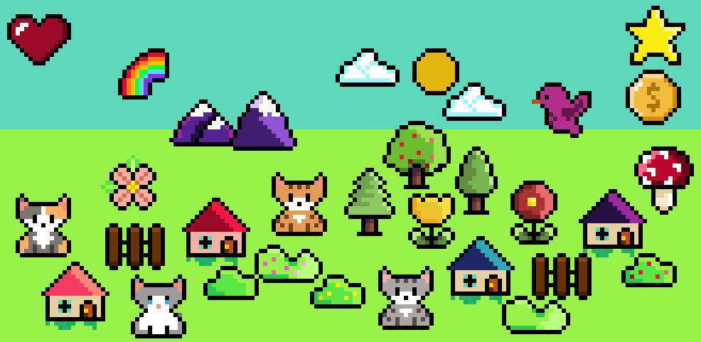 The pack contains: Eleven different kitties; seven different birds; houses in four different colours; three types of trees in various colours, with an without fruits; three types of flowers in different colours; mushrooms in different colours; two types of bushes in different colours, with and without fruits; two types of mountains in different colours; a bench, a rainbow; two hearts; clouds; a star; a moon; a sun; and a coin.